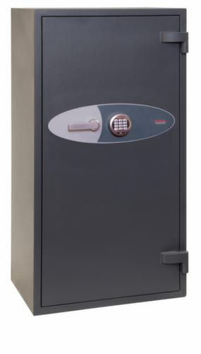 Ausstattung: Böden. Mit Flügeltür. Verschließbar mit elektronischem Hochsicherheitsschloss der VdS-Klasse II mit Doppelsteuerung, Mastercode und Zeitverzögerung. Verriegelung über 3-Wege-Winkelverriegelungsbolzen und sorgt somit für hohe Robustheit. Konstruktion aus Stahl. Korpus mit kratzfester Beschichtung in RAL7024 Graphitgrau. Front mit kratzfester Beschichtung in RAL7024 Graphitgrau. Vorbereitet zur Bodenverankerung.