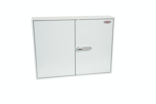 Hakenleisten verstellbar, nummeriert und in verschiedenen Farben. Die farbigen Schlüsselringe und Anhänger sorgen für einen aufgeräumten Schrankinhalt und Überblick. Staubgeschützt zu schließen über Doppel-Flügeltür. Verschließbar mit elektronischem Codeschloss, das mit einem eigenen 4-stelligen Benutzercode programmiert werden und nach Bedarf einfach geändert werden kann. Konstruktion aus Stahl. Korpus mit schlag- und kratzfester Pulverbeschichtung in grau. Front mit schlag- und kratzfester Pulverbeschichtung in grau. Vorbereitet zur Rückwandverankerung.