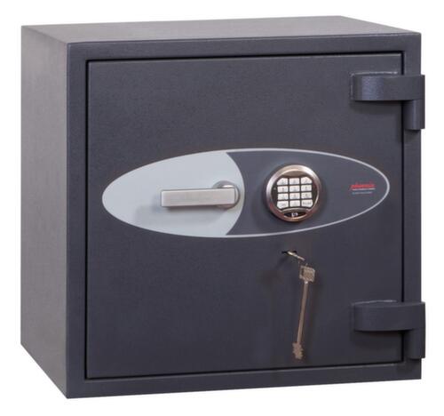 Ausstattung: Boden. Mit Flügeltür. Verschließbar mit elektronischem Hochsicherheitsschloss der VdS-Klasse II mit Doppelsteuerung, Hauptcode und Zeitverzögerung und zusätzlichem Hochsicherheits-Doppelbartschloss der VdS-Klasse II. Verriegelung über 3-Wege-Winkelverriegelungsbolzen und sorgt somit für hohe Robustheit. Die doppelwandige Konstruktion mit der speziell formulierten Betonfüllung, Bohrschutzplatten und Widerverriegelungsschutz bieten Ihnen einen Tresor mit hoher Festigkeit. Konstruktion aus Stahl. Korpus mit kratzfester Beschichtung in RAL7024 Graphitgrau. Front mit kratzfester Beschichtung in RAL7024 Graphitgrau. Vorbereitet zur Boden-/Rückwandverankerung.