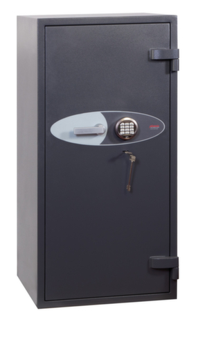 Ausstattung: Böden. Mit Flügeltür. Verschließbar mit elektronischem Hochsicherheitsschloss der VdS-Klasse II mit Doppelsteuerung, Hauptcode und Zeitverzögerung und zusätzlichem Hochsicherheits-Doppelbartschloss der VdS-Klasse II. Verriegelung über 3-Wege-Winkelverriegelungsbolzen und sorgt somit für hohe Robustheit. Die doppelwandige Konstruktion mit der speziell formulierten Betonfüllung, Bohrschutzplatten und Widerverriegelungsschutz bieten Ihnen einen Tresor mit hoher Festigkeit. Konstruktion aus Stahl. Korpus mit kratzfester Beschichtung in RAL7024 Graphitgrau. Front mit kratzfester Beschichtung in RAL7024 Graphitgrau. Vorbereitet zur Boden-/Rückwandverankerung.