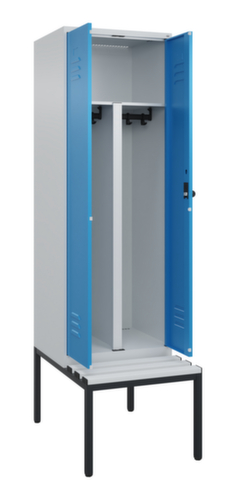 Die wichtigsten Maße des C+P Garderobenschranks Classic Plus auf einen Blick:Je Abteil 1 stabile Garderobenstange aus Ovalprofil mit 3 verdrehsicheren Doppelschiebehaken, oberhalb ein durchgehender Hutboden über je 2 Abteile. Diese extra breite Ablage bietet den idealen Stauraum für PSA-Ausrüstung wie z. B. Helme, Augen- oder Gehörschutz. Doppel-Flügeltür mit Lüftungsschlitzen und Etikettenrahmen. Die innenliegenden Drehbolzen der einschlagenden Türen bieten den Vorteil einer sauberen Optik, da keine Schrauben oder Scharniere von außen sichtbar sind. Dadurch wird das Design des Schrankes nicht beeinträchtigt und das gesamte Möbelstück wirkt hochwertiger. Damit ist auch die glatte Oberfläche leichter zu reinigen, da keine Schmutz- oder Staubablagerungen an unzugänglichen Stellen zu befürchten sind. Jede Tür ist serienmäßig mit einer Anschlagsdämpfung ausgestattet, so dass, auch durch ein schwungvolles Schließen, die Tür nicht zuknallt. Das trägt nicht nur zu einer angenehmeren Geräuschkulisse bei, sondern schont auch den Stahlschrank vor Beschädigungen. Von der Natur inspiriert schafft der BIONIC Steel Frame eine besonders effiziente und stabile Konstruktion. Durch eine raffinierte innere Struktur aus Faltungen, Streben und Zwischenräumen, sowie höhere Materialstärke an entscheidenden Stellen, wie z. B. im vorderen Bereich der Seitenwände und in den Trennwand- und Kastenprofilen, wird die Verwindungssteifigkeit zusätzlich erhöht. Verschließbar mit Sicherheits-Drehriegel für Vorhängeschloss. Das Sicherheitsschloss ist besonders aufbruchsicher, da es im verschlossenen Zustand durchdreht und erst nach Entfernung des Schlosses einrastet. Passend für alle Vorhängeschlösser mit einer Bügelstärke von 6 - 8 mm. Pro Person stehen 2 Abteile zur Verfügung, die über die zueinander schlagenden Türen gemeinsam verschließbar sind. Dadurch ist eine strikte und saubere Trennung von Arbeits- und Alltagskleidung ganz einfach möglich. Die zusätzlichen Lüftungsöffnungen im Abteil, kombiniert mit den Lüftungsschlitzen in der Tür, verbessern den Luftstrom. Dadurch wird der Schrankinhalt besser belüftet und trocknet schneller, ohne unangenehme Gerüche zu verursachen. Die untergebaute Sitzbank sorgt für eine effiziente Nutzung des verfügbaren Raumes. Sie ermöglicht ein bequemes An- und Ausziehen und bietet direkt noch Stauraum, ohne zusätzlichen Platz zu beanspruchen. Die Leisten sind aus Kunststoff. Das untergebaute Fußgestell reduziert mögliche Ansammlungen von Schmutz und Staub, da eine vollflächige Reinigung einfach möglich ist. Zudem wird zusätzlicher Stauraum unter dem Schrank geschaffen. Schuhe und Taschen stehen nicht mehr im Raum und stellen weniger Stolpergefahr dar. Konstruktion aus Stahl, stabil verschweißt. Das macht die Konstruktion besonders robust und widerstandsfähig und somit langlebiger. Die verschweißten Ecken und Kanten des Korpus gewährleisten eine höhere Dichtigkeit und somit eine bessere Schutzfunktion gegen Staub, Feuchtigkeit und Schmutz als eine geschraubte Konstruktion. Zudem sind keine regelmäßigen Wartungsarbeiten und Nachjustierungen nötig. Korpus mit Einbrennlackierung in RAL7035 Lichtgrau, Front mit Einbrennlackierung in RAL5012 Lichtblau.
