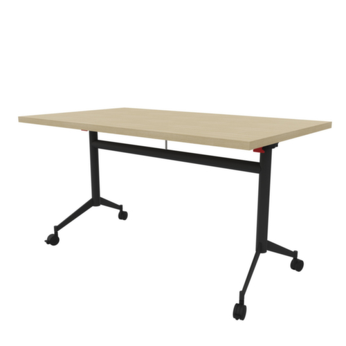 Zum Verstauen bei Nichtgebrauch kann die Tischplatte über die Griffstange um 90° gekippt werden. Plattenform eckig. T-Fußgestell aus Metall mit Epoxidpulverbeschichtung in dunkelgrau. Ovalrohr. 4 Rollen unter dem Gestell sorgen für die nötige Mobilität im Arbeitsalltag. Platte aus Holzwerkstoffplatte mit abriebfester und feuchtigkeitsbeständiger Melaminbeschichtung in Dekor Eiche. Plattenstärke 30 mm. Alle Kanten sind durch schlagfeste ABS-Umleimer vor unschönen Rissen und Ausbrechen geschützt. Ausgestattet mit Haken- und Verriegelungssystem zur frontalen und seitlichen Verbindung von Tischplatten.