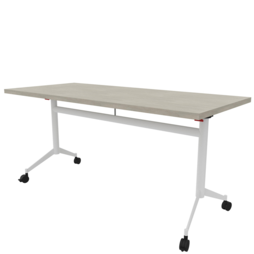 Zum Verstauen bei Nichtgebrauch kann die Tischplatte über die Griffstange um 90° gekippt werden. Plattenform eckig. T-Fußgestell aus Metall mit Epoxidpulverbeschichtung in weiß. Ovalrohr. 4 Rollen unter dem Gestell sorgen für die nötige Mobilität im Arbeitsalltag. Platte aus Holzwerkstoffplatte mit abriebfester und feuchtigkeitsbeständiger Melaminbeschichtung in Dekor Beton. Plattenstärke 30 mm. Alle Kanten sind durch schlagfeste ABS-Umleimer vor unschönen Rissen und Ausbrechen geschützt. Ausgestattet mit Haken- und Verriegelungssystem zur frontalen und seitlichen Verbindung von Tischplatten.