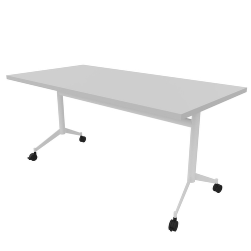 Zum Verstauen bei Nichtgebrauch kann die Tischplatte über die Griffstange um 90° gekippt werden. Plattenform eckig. T-Fußgestell aus Metall mit Epoxidpulverbeschichtung in weiß. Ovalrohr. 4 Rollen unter dem Gestell sorgen für die nötige Mobilität im Arbeitsalltag. Platte aus Holzwerkstoffplatte mit abriebfester und feuchtigkeitsbeständiger Melaminbeschichtung in Dekor grau. Plattenstärke 30 mm. Alle Kanten sind durch schlagfeste ABS-Umleimer vor unschönen Rissen und Ausbrechen geschützt. Ausgestattet mit Haken- und Verriegelungssystem zur frontalen und seitlichen Verbindung von Tischplatten.