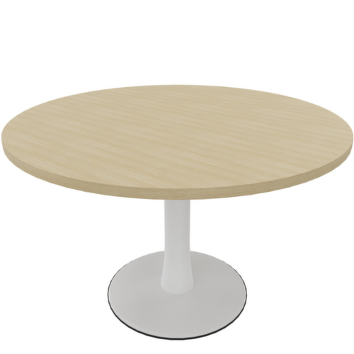 Form rund. Tellerfußgestell aus Stahl mit Epoxidpulverbeschichtung in weiß, Säule mit Epoxidpulverbeschichtung. Rundrohr. Platte aus Holzwerkstoffplatte mit abriebfester und feuchtigkeitsbeständiger Melaminbeschichtung in Dekor Eiche. Plattenstärke 30 mm. Kante mit schlagfestem ABS-Umleimer, der vor unschönen Rissen und Ausbrechen schützt. Plattenkante in Eiche.