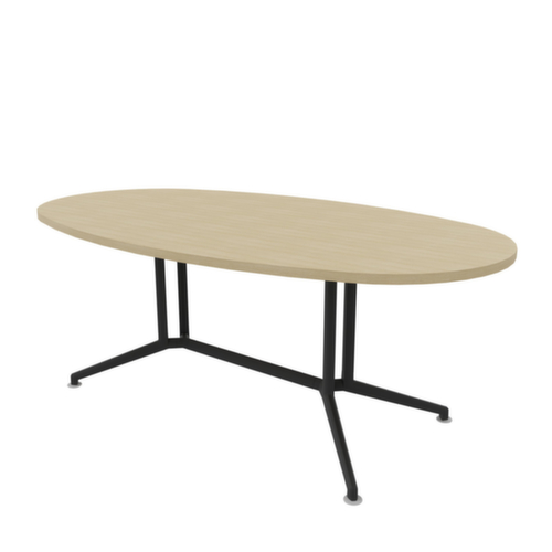 Form oval. V-Formgestell aus Stahl mit Epoxidpulverbeschichtung in dunkelgrau. Vierkant- und Rundrohr. Gestell mit nivellierbaren Kunststoffgleitern, mit denen sich Bodenunebenheiten optimal ausbessern lassen. Platte aus Holzwerkstoffplatte mit abriebfester und feuchtigkeitsbeständiger Melaminbeschichtung in Dekor Eiche. Plattenstärke 30 mm. Kante mit schlagfestem ABS-Umleimer, der vor unschönen Rissen und Ausbrechen schützt. Plattenkante in Eiche. Traversen mit Epoxidpulverbeschichtung.