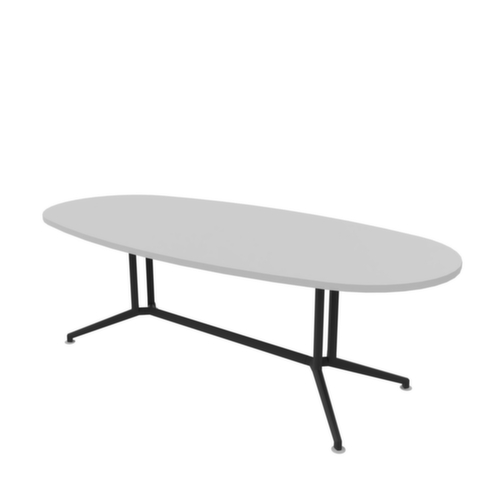 Form oval. V-Formgestell aus Stahl mit Epoxidpulverbeschichtung in dunkelgrau. Vierkant- und Rundrohr. Gestell mit nivellierbaren Kunststoffgleitern, mit denen sich Bodenunebenheiten optimal ausbessern lassen. Platte aus Holzwerkstoffplatte mit abriebfester und feuchtigkeitsbeständiger Melaminbeschichtung. Plattenstärke 30 mm. Kante mit schlagfestem ABS-Umleimer, der vor unschönen Rissen und Ausbrechen schützt. Traversen mit Epoxidpulverbeschichtung.