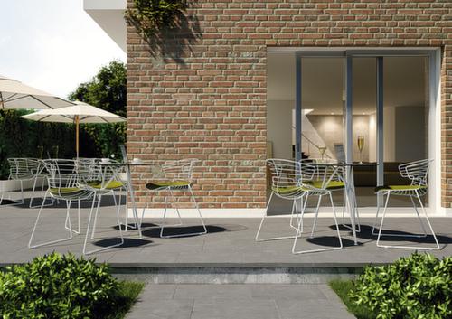 "longDescription": "<h2>Besucherstuhl</h2><ul><li>Mit offener Sitzschale aus Draht</li><li>Kufengestell mit Bodengleitern</li><li>Stapelbar</li></ul><br>Dieser Besucherstuhl ist absolut wetterfest und somit für Ihren Außenbereich perfekt geeignet. Er kann sowohl für Kantinen- und Raucherbereiche, als auch als dekorativer Eyecatcher im Empfangsbereich platziert werden.<br><br>Die offene Sitzschale ist komplett aus Draht. Die wetterfeste Lackierung verhindert ein rosten oder abblättern der Oberfläche. Mit dem Kufengestell hat der Stuhl immer einen festen Stand und die Bodengleiter schützen zusätzlich ihren Boden. <br><br>Sollten Sie den Besucherstuhl mal nicht benötigen können Sie in platzsparend stapeln. Dadurch nimmt er wenig Lagerfläche in Anspruch.<br><br><strong>Gut zu wissen!</strong><br><br>Die passenden Sitzpolster sind als Zubehör in verschiedenen Farben erhältlich. Der Bezug ist aus Polyester und das Polster ist zusätzlich schwer entflammbar nach DIN 4102-B1 getestet.<br>",