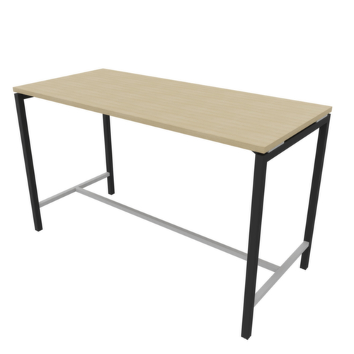 Plattenform eckig. 4-Fußgestell mit Quer- und Längsstreben aus 40 x 40 mm Vierkantstahlrohr mit Epoxidpulverbeschichtung in dunkelgrau. Traversen silber. Nivellierfüße sorgen durch den Ausgleich von Unebenheiten für einen stabilen Stand. Platte aus Holzwerkstoffplatte mit kratzfester und pflegeleichter Melaminharzbeschichtung in Dekor Eiche. Plattenstärke 30 mm. Alle Kanten sind durch schlagfeste ABS-Umleimer vor unschönen Rissen und Ausbrechen geschützt.