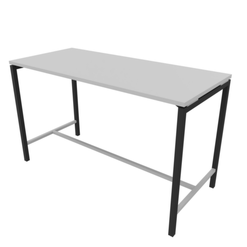 Plattenform eckig. 4-Fußgestell mit Quer- und Längsstreben aus 40 x 40 mm Vierkantstahlrohr mit Epoxidpulverbeschichtung in dunkelgrau. Traversen silber. Nivellierfüße sorgen durch den Ausgleich von Unebenheiten für einen stabilen Stand. Platte aus Holzwerkstoffplatte mit kratzfester und pflegeleichter Melaminharzbeschichtung in Dekor grau. Alle Kanten sind durch schlagfeste ABS-Umleimer vor unschönen Rissen und Ausbrechen geschützt.
