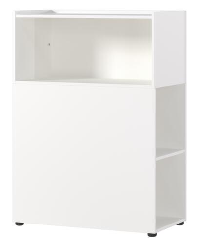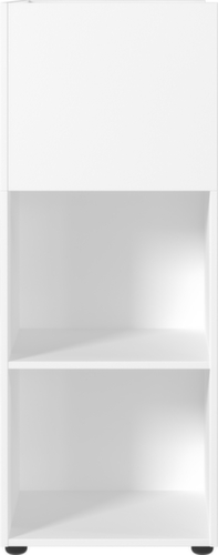 Nutzung dreiseitig – frei im Raum platzierbar schafft der Raumteiler nicht nur individuelle Arbeitsbereiche und mehr Privatsphäre, sondern auch Stauraum mit direktem Zugriff. Konstruktion aus Spanplatte mit pflegeleichter Melaminharzbeschichtung. Korpus in weiß, Alle Kanten sind durch schlagfeste ABS-Umleimer vor unschönen Rissen und Ausbrechen geschützt. Unterbau Kunststoffgleiter.