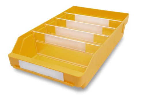 Aus bruchsicherem Polypropylen, in gelb. Seitliche Nutenführungen und Bodenfixierungen ermöglichen das Einstecken von Querteilern und erlauben somit eine individuelle Kasten-Unterteilung. Sichtöffnung. Mit Etikettierfläche. Temperaturbeständig von -20 °C bis +80 °C. Material Lebensmittelgeeignet.