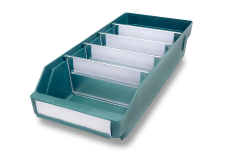 Aus bruchsicherem Polypropylen, in grün. Seitliche Nutenführungen und Bodenfixierungen ermöglichen das Einstecken von Querteilern und erlauben somit eine individuelle Kasten-Unterteilung. Sichtöffnung. Mit Etikettierfläche. Temperaturbeständig von -20 °C bis +80 °C. Material Lebensmittelgeeignet.