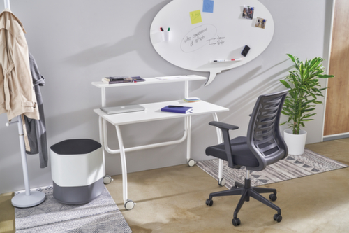 Synchronmechanik. Stuhl mit höhenverstellbaren Armlehnen mit Kunststoffauflagen. Sitz aus Schaumstoff in schwarz. Der Bezugstoff ist feuerhemmend. Sitzneigungsverstellung.