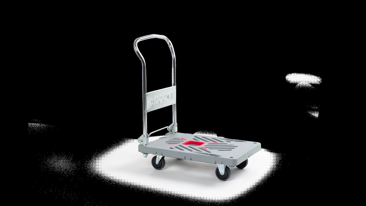 Konstruktion aus Stahl (verschraubt). Plattform aus Kunststoff. Plattform durchbrochen mit Griffloch in der Ladefläche. Dank der Aussparung in der Mitte kann der Plattformwagen zusammengeklappt einfach und unkompliziert per Hand gegriffen und unter dem Arm getragen werden. Plattform wasserfest. Schiebebügel klappbar. Gestell in grau. Die untergebauten 2 Lenk- und 2 Bockrollen ermöglichen ein müheloses Bewegen mit hoher Spursicherheit auf geraden und kurvigen Strecken bei wenig Kraftaufwand, der Feststeller für die zwei Hinterrollen gewährt dabei stets einen festen Stand. Rad Ø 100 mm. Räder mit bodenschonender TPE-Bereifung.Unser Kundenservice-Team steht Ihnen gerne zur Verfügung.