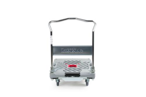 Konstruktion aus Stahl (verschraubt). Plattform aus Kunststoff. Plattform durchbrochen mit Griffloch in der Ladefläche. Dank der Aussparung in der Mitte kann der Plattformwagen zusammengeklappt einfach und unkompliziert per Hand gegriffen und unter dem Arm getragen werden. Plattform wasserfest. Schiebebügel klappbar. Gestell in grau. Die untergebauten 2 Lenk- und 2 Bockrollen ermöglichen ein müheloses Bewegen mit hoher Spursicherheit auf geraden und kurvigen Strecken bei wenig Kraftaufwand, der Feststeller für die zwei Hinterrollen gewährt dabei stets einen festen Stand. Rad Ø 130 mm. Räder mit pannensicherer, bodenschonender Vollgummi-Bereifung.Unser Kundenservice-Team steht Ihnen gerne zur Verfügung.