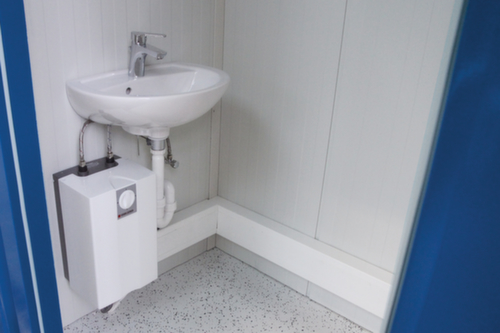 "longDescription": "<h2>Toilettencontainer</h2><ul><li>Optimal für den mobilen oder ortsfesten Einsatz geeignet</li><li>Ortsfeste Installation öffentlichen Plätzen oder Werksgeländen</li><li>Mobiler Einsatz auf Baustellen, Messen oder Veranstaltungen dank Kranösen</li></ul><br><h3>Container:</h3><ul><li>Seitenwände und Dach aus wärmedämmenden Sandwich-Elementen</li><li>Deckenschalen aus bandverzinktem Stahl mit Beschichtung</li><li>Dach mit integrierten Regenrinnen an den Längsseiten</li><li>Kippfenster mit Rahmen aus Kunststoff und Scherenbeschlag</li><li>Doppelverglasung mit Ornament- und Wärmeschutzverglasung</li><li>Wände, Boden und Decke sind leicht zu reinigen, da alle Oberflächen abwaschbar sind</li><li>Stabiler Bodenrahmen aus Stahl mit eingelegten und verzinkten Blindblechen</li><li>Boden mit 100 mm Mineralwolldämmung und 22 mm starker Auflage aus OSB-Flachpressplatten</li><li>Bodenbelag aus pflegeleichtem und robustem PVC</li></ul><br><h3>Ausstattung:</h3><ul><li>1 Stand-WC mit Spülkasten</li><li>Klappbarer WC-Sitz mit Deckel</li><li>1 Urinal mit Druckspüler</li><li>1 Handwaschbecken mit Standhahn für Kaltwasser</li><li>Spiegel und Kunststoffablage</li><li>Toilettenpapierhalter und Kleiderhaken</li></ul><br><h3>Tür:</h3><ul><li>Einflügelige Tür DIN rechts</li><li>Doppelwandig</li><li>Von innen mit Drehknopf abschließbar</li><li>Von außen mit Profilzylinderschloss inklusive 3 Schlüsseln</li></ul><br><h3>Elektroausstattung:</h3><ul><li>Anschluss durch die Außenwand in den Verteilerkasten</li><li>Verteilerkasten mit LS-Schaltern und FI-Schalter</li><li>Langfeldleuchte 1 x 18 W mit Lichtschalter</li><li>2 Schuko-Steckdosen, davon eine für Heizung</li></ul><br><h3>Wasserinstallation:</h3><ul><li>Zuwasser über 3/4\" Rohr durch die Außenwand </li><li>Leitungen im Inneren aus PVC und Aluminiumverbund</li><li>Alle Leitungen auf Putz verlegt</li></ul><br><h3>Allgemeine Maße:</h3><ul><li>Tür HxB 2000x875 mm</li><li>Fenster 590/415 mm</li><li>Maximale Schneelast 220 kg/m²</li><li>Maximale Bodenbelastung 500 kg/m²</li><li>Wände und Dach U = 0,47 W/(m²K)</li><li>Boden U = 0,34 W/(m²K)</li><li>Fenster K = 1,3 Wm²K (m²/F-Fläche)</li></ul><br><h3>Anlieferung:</h3><ul><li>Die Anlieferung erfolgt fertig montiert</li><li>Abladen mit Stapler oder Kran erforderlich</li></ul><br><h3>Brandschutz / Feuerschutz:</h3><ul><li>Schwer entflammbar gemäß EN 13501-1</li></ul><br><h3>Erfüllte Richtlinien / Norm:</h3><ul><li>Elektroinstallation nach VDE 100</li></ul><br><h3>Nutzungshinweis:</h3><ul><li>Container müssen immer auf einem tragfähigen und befestigten Untergrund abgestellt werden</li><li>Bei unbefestigtem Untergrund kann ein einfaches Fundament aus Gehwegplatten angelegt werden, dies schützt auch vor Staunässe</li></ul><p>Bitte beachten Sie: Die Abbildung ist dem Produkt ähnlich.</p>",