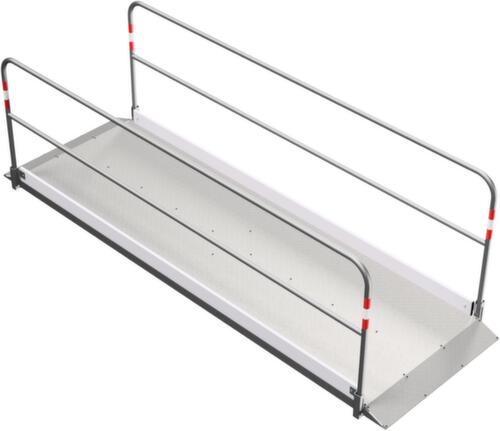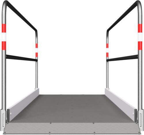 Die wichtigsten Maße auf einen Blick:Gestell aus Stahl mit korrosionsschützender Zinkbeschichtung. Trittfläche aus Aluminium mit rutschfestem Tränenblech. Ausgestattet mit Auffahrrampe und reflektierenden Seitengeländern. Beide Geländer sind für den platzsparenden Transport und Lagerung umlegbar.