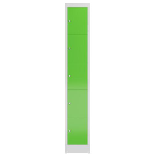 Flügeltür. Verschließbar mit Zylinderschloss. Konstruktion aus Stahl, verschweißt. Korpus mit elektrostatischer Pulverbeschichtung in RAL7035 Lichtgrau. Front mit elektrostatischer Pulverbeschichtung in RAL6018 Gelbgrün.
