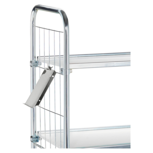 "longDescription": "<h2>Etagenwagen modular und mit Zubehör</h2><h3>Der flexible Etagenwagen mit zahlreichen Variationsmöglichkeiten</h3><ul><br><li>Schreibunterlage für Etagenwagen</li><br><li>Klammer: Zum festklemmen von Unterlagen</li><br><li>Gut geeignet für Größe DIN A4 oder kleiner</li><br><li>Flache Anlieferung</li><br></ul><p>Der modulare Etagenwagen passt sich Ihren Anforderungen an. Die vier laminierten Böden können stufenlos in der gewünschten Höhe montiert werden. Dadurch können sowohl niedrige als auch höhere Güter von A nach B transportiert werden. Der Etagenwagen besitzt einen justierbaren Schiebebügel, der auf die benötigte Position gebracht werden kann. Der Rahmen besteht aus elektrolytisch verzinktem Stahl und ist dadurch besonders robust.</p><br><h3>Modularer Etagenwagen – schmal und besonders wendig!</h3><br><p>Dank seiner 4 Lenkrollen (Ø 12,5 cm) ist der Etagenwagen besonders wendig und lässt sich leicht manövrieren. Zudem ist er an zwei Rollen mit Feststellbremsen ausgestattet, wodurch ein ungewolltes Wegrollen verhindert wird. Dank seiner schmalen Breite von 470 mm ist der Etagenwagen ideal für enge Gänge oder Räume geeignet.</p><br><p>Zerlegte Anlieferung im flachen Paket, inkl. Schrauben und Anleitung.</p><br><p>Optional erhältlich:</p><br><p><strong>Leiter mit 3 Stufen (Bestell-Nr. 286700):</strong> Für einfaches Be- und Entladen in größerer Höhe. Die Leiter ist einfach am Etagenwagen festzuschrauben und so immer parat, wenn sie benötigt wird. Maximale Tragfähigkeit: 125 kg</p><br><p><strong>Schreibunterlage (Bestell-Nr. 145I):</strong> Mit Klammer zum Festklemmen der Unterlagen. Gut geeignet für Größe DIN A4 oder kleiner.</p><br>",
