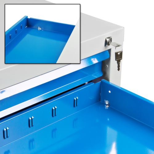 Konstruktion aus Stahl. Schubladenausstattung: Schubladennutzmaß Breite x Tiefe 570 x 338 mm, Nutzhöhe = Fronthöhe - 15 mm. Traglast je Schublade 40 kg. Der Vollauszug gewährt zu 100% einfachen Zugriff bis in die letzte Ecke. Der kugelgelagerte Auszug ermöglicht ein leichtes Öffnen und Schließen der Schublade. Mit Auszugsperre. Mithilfe der Sperre wird das unbeabsichtigte komplette Herausziehen aller Schubladen verhindert. Verschließbar mit Zentralverschluss. Korpus mit schlag- und kratzfester Pulverbeschichtung in RAL7035 Lichtgrau. Front mit schlag- und kratzfester Pulverbeschichtung in RAL5012 Lichtblau.