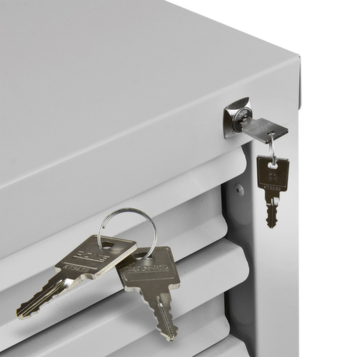 Konstruktion aus Stahl. Schubladenausstattung: Schubladennutzmaß Breite x Tiefe 570 x 338 mm, Nutzhöhe = Fronthöhe - 15 mm. Traglast je Schublade 40 kg. Der Vollauszug gewährt zu 100% einfachen Zugriff bis in die letzte Ecke. Der kugelgelagerte Auszug ermöglicht ein leichtes Öffnen und Schließen der Schublade. Mit Auszugsperre. Mithilfe der Sperre wird das unbeabsichtigte komplette Herausziehen aller Schubladen verhindert. Verschließbar mit Zentralverschluss. Korpus mit schlag- und kratzfester Pulverbeschichtung in RAL7035 Lichtgrau. Front mit schlag- und kratzfester Pulverbeschichtung in RAL7035 Lichtgrau.