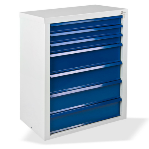 Konstruktion aus Stahl. Schubladenausstattung: Schubladennutzmaß Breite x Tiefe 570 x 338 mm, Nutzhöhe = Fronthöhe - 15 mm. Traglast je Schublade 40 kg. Der Vollauszug gewährt zu 100% einfachen Zugriff bis in die letzte Ecke. Der kugelgelagerte Auszug ermöglicht ein leichtes Öffnen und Schließen der Schublade. Mit Auszugsperre. Mithilfe der Sperre wird das unbeabsichtigte komplette Herausziehen aller Schubladen verhindert. Verschließbar mit Zentralverschluss. Korpus mit schlag- und kratzfester Pulverbeschichtung in RAL7035 Lichtgrau. Front mit schlag- und kratzfester Pulverbeschichtung in RAL5012 Lichtblau.