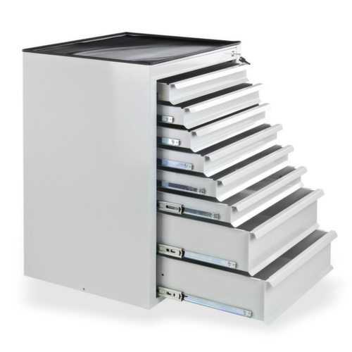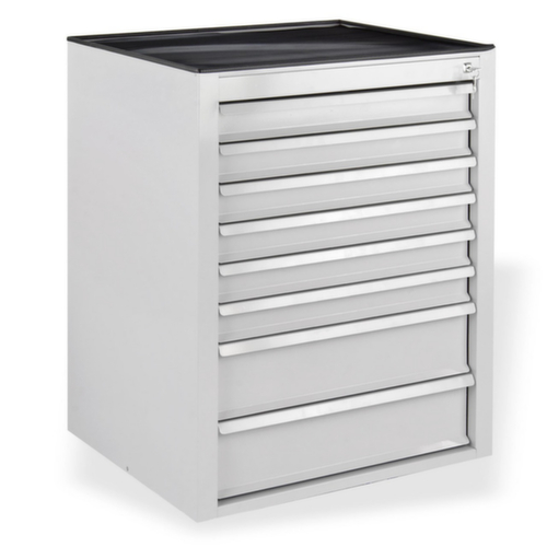 Konstruktion aus Stahl. Schubladenausstattung: Schubladennutzmaß Breite x Tiefe 570 x 405 mm. Traglast je Schublade 30 kg. Der Vollauszug gewährt zu 100% einfachen Zugriff bis in die letzte Ecke. Der kugelgelagerte Auszug ermöglicht ein leichtes Öffnen und Schließen der Schublade. Mit Auszugsperre. Mithilfe der Sperre wird das unbeabsichtigte komplette Herausziehen aller Schubladen verhindert. Verschließbar mit Zentralverschluss. Korpus mit schlag- und kratzfester Pulverbeschichtung in RAL7016 Anthrazitgrau. Front mit schlag- und kratzfester Pulverbeschichtung in RAL7035 Lichtgrau. Die Ablagefläche ist mit einer Gummimatte ausgestattet. Die rutschhemmende Matte verhindert, dass abgelegte Gegenstände einfach vom Schrank rollen oder fallen.