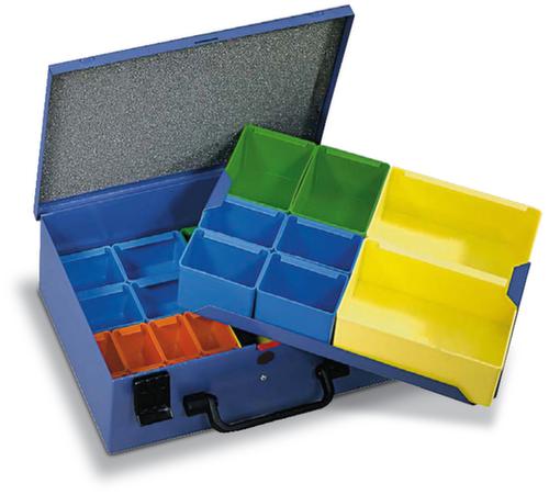Verschließbar über Sicherheitsschloss. Kästen herausnehmbar und beschriftbar. Mit Tragegriff. Koffer aus Stahl / Kästen aus schlagzähem Polystyrol. Koffer mit schlag- und kratzfester Pulverbeschichtung in RAL5007 Brillantblau. Kästen in farbig. Verschließbar mit Deckel, mit Schaumstoff-Presspolster.
