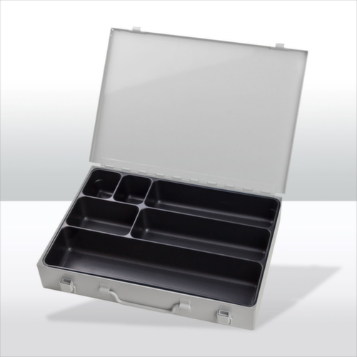 Verschließbar über 2 Spannverschlüssen. Ausgestattet mit herausnehmbarer Unterteilung. Mit Tragegriff. Koffer aus Stahlblech / Kästen aus Kunststoff. Koffer mit schlag- und kratzfester Pulverbeschichtung in RAL7035 Lichtgrau. Kästen in schwarz.