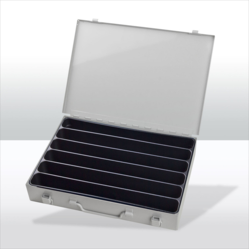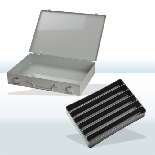 Verschließbar über 2 Spannverschlüssen. Ausgestattet mit herausnehmbarer Unterteilung mit gleich langen Fächern. Mit Tragegriff. Koffer aus Stahlblech / Kästen aus Kunststoff. Koffer mit schlag- und kratzfester Pulverbeschichtung in RAL7035 Lichtgrau. Kästen in schwarz.