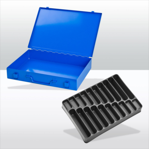 Verschließbar über 2 Spannverschlüssen. Ausgestattet mit herausnehmbarer Unterteilung. Mit Tragegriff. Koffer aus Stahlblech / Kästen aus Kunststoff. Koffer mit schlag- und kratzfester Pulverbeschichtung in RAL5015 Himmelblau. Kästen in schwarz.
