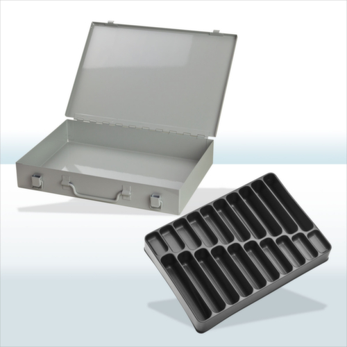 Verschließbar über 2 Spannverschlüssen. Ausgestattet mit herausnehmbarer Unterteilung. Mit Tragegriff. Koffer aus Stahlblech / Kästen aus Kunststoff. Koffer mit schlag- und kratzfester Pulverbeschichtung in RAL7035 Lichtgrau. Kästen in schwarz.