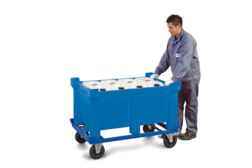 Die wichtigsten Maße des Stapelbehälters auf einen Blick:Aus schlagfestem Polyethylen in blau. Wände geschlossen, Boden geschlossen. Stapelecken sicher 5-fach stapelbar.