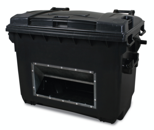 "longDescription": "<h2>Streugutbehälter</h2><strong>leichtes Befüllen durch große Öffnung</strong><br><ul><li><strong>Extrem widerstandsfähig</strong> - aus Hochdruck-Polyethylen (HDPE)</li><li><strong>Deckel komplett aufklappbar</strong> und zusätzlich im halb oder ganz geöffneten Zustand arretierbar</li><li><strong>Kein Wasserstau</strong> - Wasserablauf mit Verschlussstopfen im Boden</li><li><strong>Einfach zu transportieren</strong> dank Aufnahme-Kammleisten und Aufnahmezapfen für Kammschüttungen (mit entsprechend ausgestatteten Fahrzeugen)</li></ul><br><strong>Gut zu wissen!</strong><br><br>Streuen Sie nie mit Salz, sondern immer mit Split oder Sand! Dies ist besser für die Umwelt, da das Salz in den Boden einsickert und somit äußerst schädlich für die Tier- und Pflanzenwelt ist.<br>",