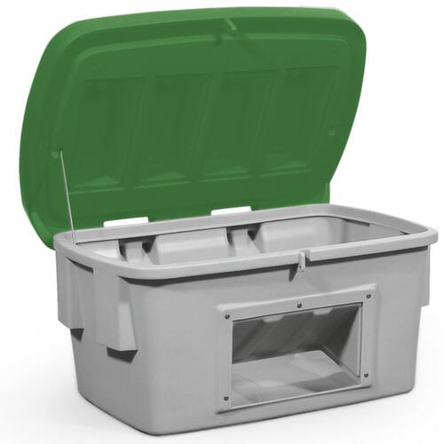 Aus schlagfestem Polyethylen. Ausgestattet mit schnell und einfach demontierbarem Klappdeckel - ganz ohne Werkzeug. Abschließbar: dank Einhängekonstruktion an Deckel und Korpus kann wahlweise bequem ein Vorhängeschloss angebracht werden. So ist stets ein Schutz vor unbefugtem Zugriff erreichbar. Behälter grau, Deckel grün. Wände geschlossen mit praktischer Entnahmeöffnung. Dadurch lässt sich Material einfach entnehmen, ganz ohne dass der Deckel geöffnet werden muss. Boden geschlossen. Mit offenem Deckel ineinander stapelbar.