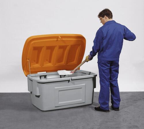 Aus schlagfestem Polyethylen. Ausgestattet mit schnell und einfach demontierbarem Klappdeckel - ganz ohne Werkzeug. Abschließbar: dank Einhängekonstruktion an Deckel und Korpus kann wahlweise bequem ein Vorhängeschloss angebracht werden. So ist stets ein Schutz vor unbefugtem Zugriff erreichbar. Behälter grau, Deckel orange. Wände geschlossen - als Ausführung ohne Entnahmeöffnung. Dies trägt zu zusätzlicher Robustheit des Sammelbehälters bei. Boden geschlossen. Mit offenem Deckel ineinander stapelbar.