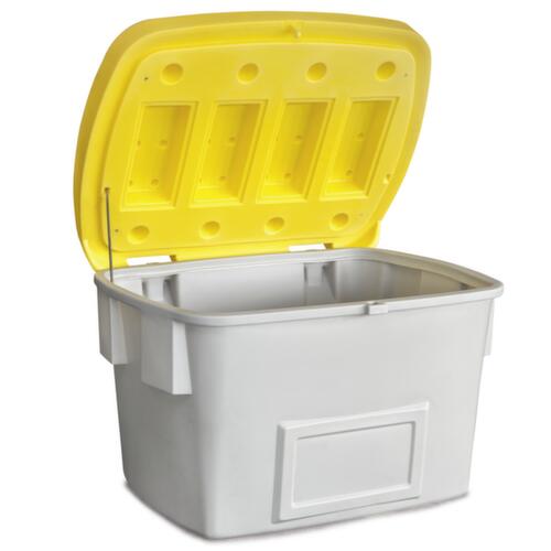 Aus schlagfestem Polyethylen. Ausgestattet mit schnell und einfach demontierbarem Klappdeckel - ganz ohne Werkzeug. Abschließbar: dank Einhängekonstruktion an Deckel und Korpus kann wahlweise bequem ein Vorhängeschloss angebracht werden. So ist stets ein Schutz vor unbefugtem Zugriff erreichbar. Behälter grau, Deckel gelb. Wände geschlossen - als Ausführung ohne Entnahmeöffnung. Dies trägt zu zusätzlicher Robustheit des Sammelbehälters bei. Boden geschlossen. Mit offenem Deckel ineinander stapelbar.