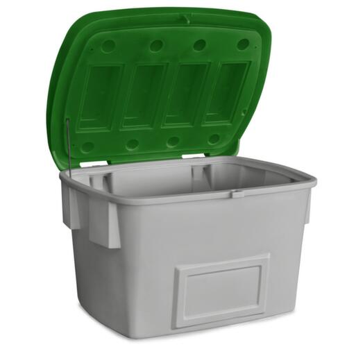 Aus schlagfestem Polyethylen. Ausgestattet mit schnell und einfach demontierbarem Klappdeckel - ganz ohne Werkzeug. Abschließbar: dank Einhängekonstruktion an Deckel und Korpus kann wahlweise bequem ein Vorhängeschloss angebracht werden. So ist stets ein Schutz vor unbefugtem Zugriff erreichbar. Behälter grau, Deckel grün. Wände geschlossen - als Ausführung ohne Entnahmeöffnung. Dies trägt zu zusätzlicher Robustheit des Sammelbehälters bei. Boden geschlossen. Mit offenem Deckel ineinander stapelbar.