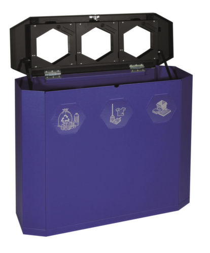 Innenbehälter mit korrosionsschützender Zinkbeschichtung. Einfache Entleerung über herausnehmbaren Innenbehälter. Über Gasdruckfedern wird das aufklappbare Kopfteil offen gehalten. So bleiben die Hände frei für eine schnelle Entnahme des Mülls. Verschließbar mit Vierkantschloss. Korpus aus Qualitätsstahlblech in ultramarinblau-metallic. Kopfteil aus Edelstahl. Unterbau stirnseitig mit 2 Rollen zum einfachen verschieben für z. B. Reinigungsarbeiten.