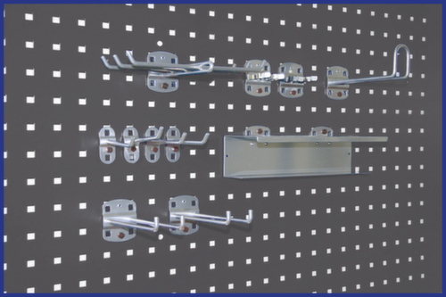 "value": "4 Einzelhaken, 2 Doppelhaken, 2 Stielklemmen, Schlauch-/Kabelhalter, Werkzeughalter 6-fach, Runddosenhalter 3-fach"