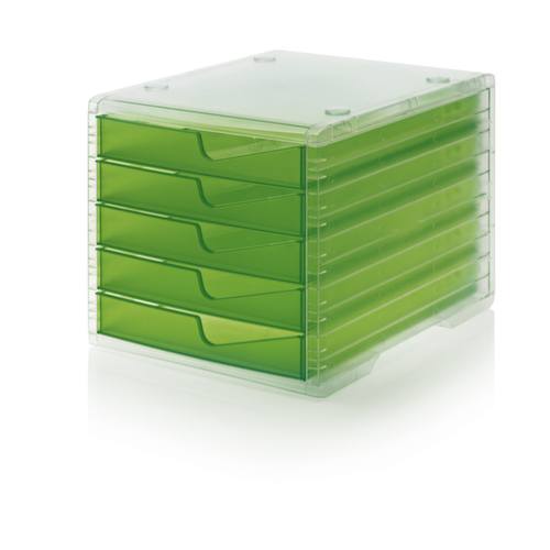 "metaDescription": "Styro Schubladenbox styroswingbox light, für DIN C4 - 5xDIN C4, Tischaufstellung, HxBxT 255x270x340mm, Polystyrol, transparent/kiwi",