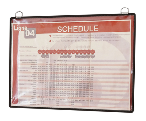 "longDescription": "<h2>Aushangtasche</h2><strong>Informationen gut geschützt präsentieren</strong><br><ul><li><strong>Robust und auffällig</strong> - Rahmen aus Stahldraht mit farbiger Kunststoffummantelung</li><li>Einfach aufhängen mit stabilem Metallaufhänger</li><li><strong>Bei jedem Wetter lesbar</strong> - Tafel aus reflexfreiem Kunststoff</li></ul>",