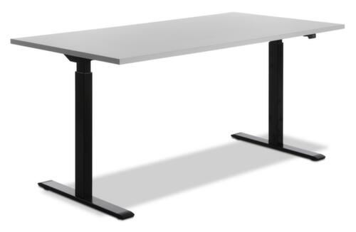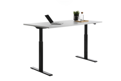Platte aus Spanplatte mit pflegeleichter Melaminharzbeschichtung in Dekor grau. Plattenform rechteckig. T-Fußgestell in schwarz. Höhenverstellung durch 2 Elektromotoren unterstützen Sie bei einer komfortablen Höhenverstellung auf Knopfdruck. Funktionen: Abspeichern und automatisches Abrufen von programmierten Tischhöhen dank Memoryfunktion. Der automatische Kollisionsschutz stoppt sofort bei Widerstand von oben oder unten und sorgt somit für absolute Sicherheit.
