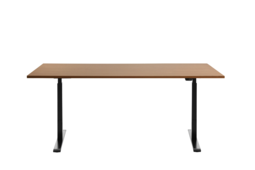 Platte aus Spanplatte mit pflegeleichter Melaminharzbeschichtung in Dekor Buche. Plattenform rechteckig. T-Fußgestell in schwarz. Höhenverstellung durch 2 Elektromotoren unterstützen Sie bei einer komfortablen Höhenverstellung auf Knopfdruck. Funktionen: Abspeichern und automatisches Abrufen von programmierten Tischhöhen dank Memoryfunktion. Der automatische Kollisionsschutz stoppt sofort bei Widerstand von oben oder unten und sorgt somit für absolute Sicherheit.