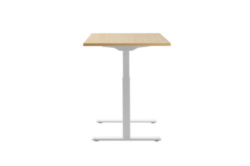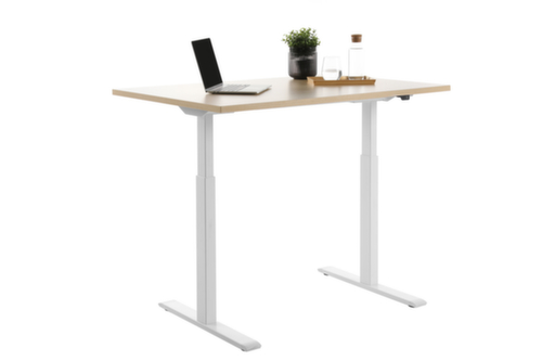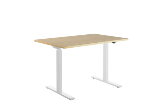 Platte aus Spanplatte mit pflegeleichter Melaminharzbeschichtung in Dekor Ahorn. Plattenform rechteckig. T-Fußgestell in weiß. Höhenverstellung durch 2 Elektromotoren unterstützen Sie bei einer komfortablen Höhenverstellung auf Knopfdruck. Funktionen: Abspeichern und automatisches Abrufen von programmierten Tischhöhen dank Memoryfunktion. Der automatische Kollisionsschutz stoppt sofort bei Widerstand von oben oder unten und sorgt somit für absolute Sicherheit.