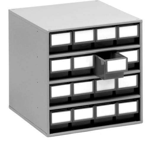 Gehäuse aus Stahl mit schlag- und kratzfester Pulverbeschichtung in RAL7035 Lichtgrau / Schubladen aus bruchsicherem Polypropylen. Schubladen in grau. Schubladenboden gewellt zum leichteren Greifen kleiner Artikel. Zum Aufhängen an der Wand oder frei aufstellbar.