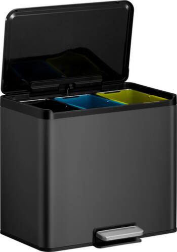 Mit Klappdeckel - die Öffnung erfolgt rückenschonend mit Fußpedal. Der Behälter besitzt eine Verschlussdämpfung und bleibt dank Stay-Open Funktion geöffnet, was das Entleeren erleichtert. Innenbehälter aus Kunststoff in schwarz/blau/gelb. Einfache Entleerung über Deckel. Korpus aus Edelstahl mit matter Beschichtung in mattschwarz. Oberfläche mit Anti-Fingerprint-Beschichtung. Hierdurch werden im Zuge der Langlebigkeit des Behälters dauerhaft Verunreinigungen wie Fett- oder Fingerabdrucksflecken vermieden, was ihn umso pflegeleichter macht. Oberfläche mit Anti-Fingerprint-Beschichtung. Hierdurch werden im Zuge der Langlebigkeit des Behälters dauerhaft Verunreinigungen wie Fett- oder Fingerabdrucksflecken vermieden, was ihn umso pflegeleichter macht. Deckel aus Kunststoff in schwarz.