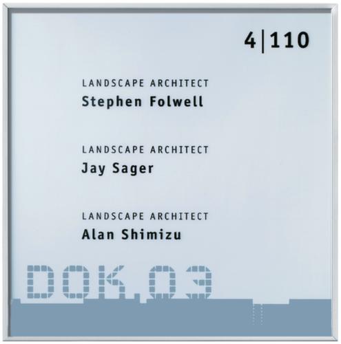 "longDescription": "<h2>Türschild</h2><strong>zur erleichterten Orientierung</strong><br><ul><li><strong>Absolute Flexibilität</strong> dank leicht zu wechselnder Papiereinlagen</li><li><strong>Schutz vor Staub</strong> - Scheibe aus Acrylglas</li><li><strong>Zeitlos und robust</strong> - Rahmen aus hochfesten Aluminiumprofilen</li></ul><br><strong>Gut zu wissen!</strong><br><br>Um die Beschriftung der Schilder noch einfacher zu machen, bestellen Sie direkt die Gestaltungs-Software und die passenden Einlagen mit!<br>",