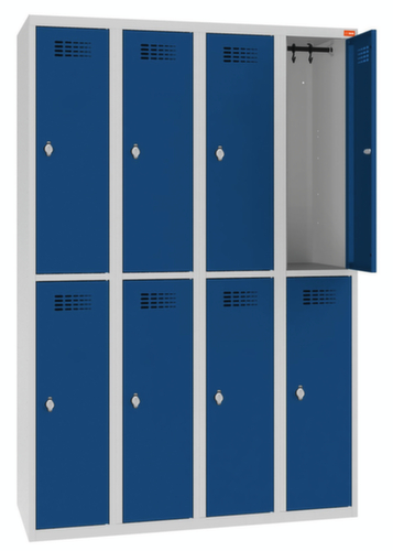 Je Abteil 1 Kleiderstange mit 2 Doppelhaken und 1 Fachboden pro Fach. Pro Fach eine Flügeltür zur geschützten Aufbewahrung. Die aufschlagenden Türen bieten den Vorteil, dass es im Schrank keinerlei Platzverlust gibt, da sie innerhalb des Schrankes keinen Platz einnehmen. Verschließbar mit Drehriegelverschluss. Die standardisierte WEMO-Perforation sorgt für optimale Luftzirkulation im Schrank. Konstruktion aus Stahlblech. Korpus mit korrosionsfester Zirkoniumbeschichtung in RAL7035 Lichtgrau, Front mit korrosionsfester Zirkoniumbeschichtung in RAL5010 Enzianblau.
